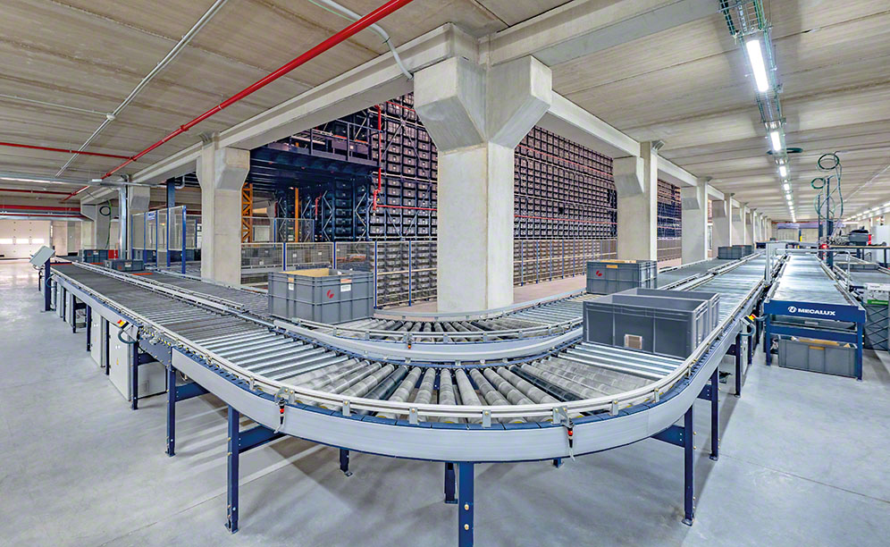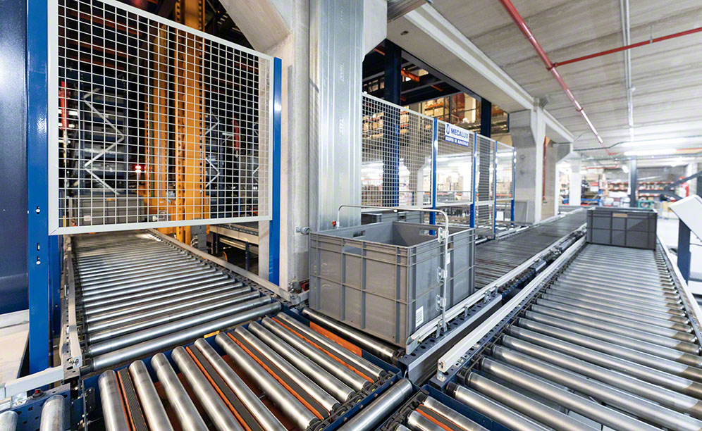 Both systems are divided into two floors with different operations. The upper floor (ground level) is where entries take place (pallets are received and boxes set to enter the miniload system are filled). On the lower floor (at a level of -3.4 m), orders are prepared and dispatched.