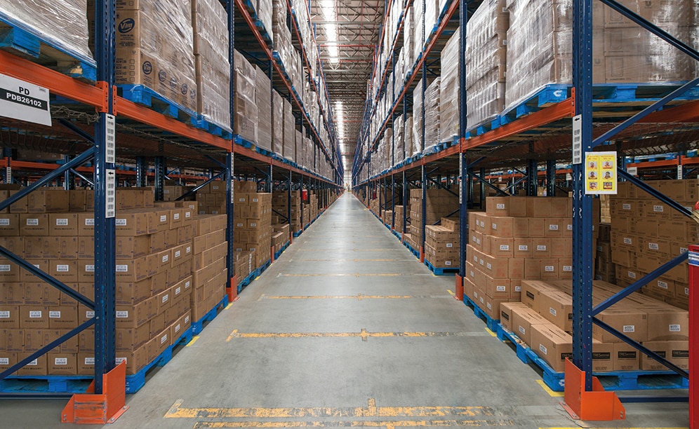 Mecalux supplied single and double-depth pallet racking that measures 11.4 m high and 152 m long, with five or six load levels.