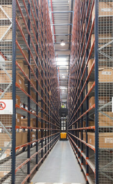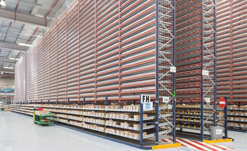 These racks are supplied from narrow aisles where high-level order pickers circulate, which are used to replenish reserve boxes and house them at higher levels. This solution provides the following benefits: