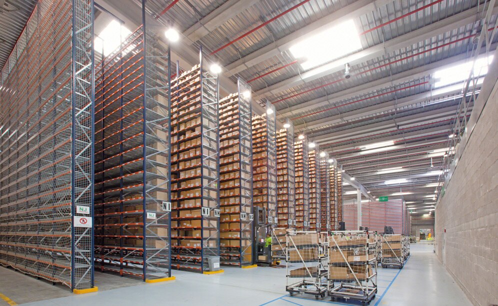 Medium-dimensioned and higher consumption products are stored in single access racks, with levels formed by perforated shelves housing different sized pallets. In this zone, trilateral lift machines are used to perform replenishment tasks, so aisles are narrower. These aisles do not interfere with the wider aisles where picking with low-level order pickers is done.